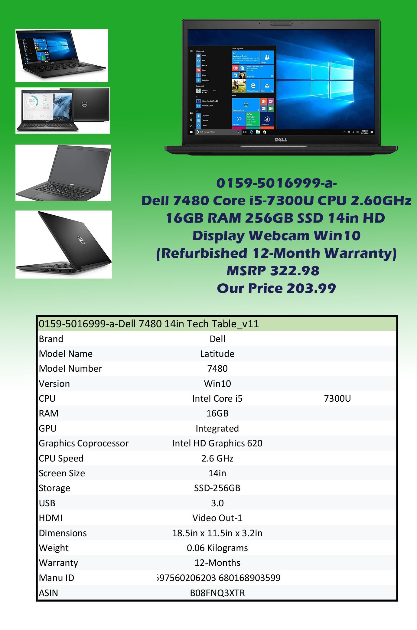 0159-5016999-a-Dell 7480 14in Laptop i5-7300U 16GB-256GBSSD CPU 2.60GHz Win10 (Refurbished 12-Month Warranty) MSRP 322.98 Our Price 203.99
